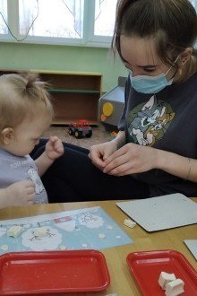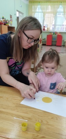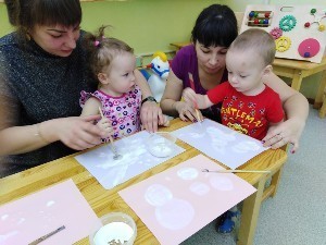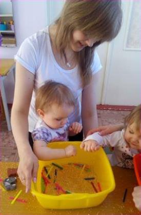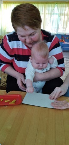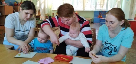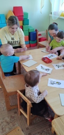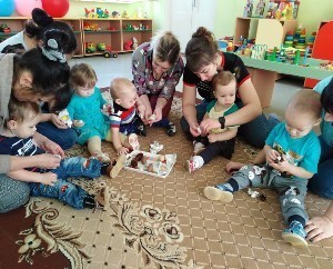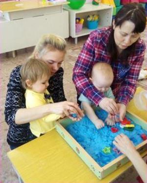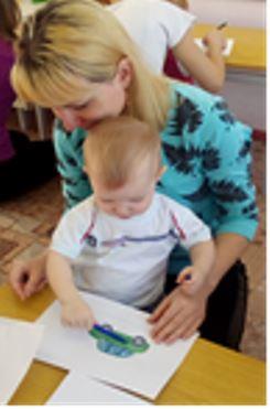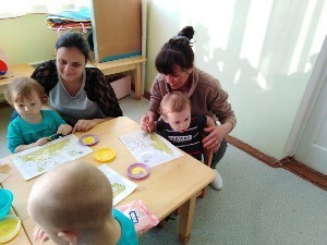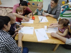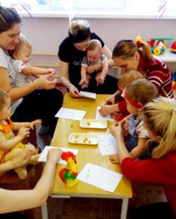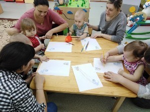 Дети вместе с мамой пробуют себя в разных видах творчества: собирают простой конструктор, лепят из пластилина, рисуют карандашами и красками, приобщаются к играм с музыкальными игрушками.