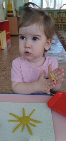 Вместе с мамами играли в пальчиковые игры "Весна пришла", "Зайка", рисовали и лепили из жгутиков солнечные лучики. Встретились с зайчонком, помогли найти ему его длинные ушки. Приготовили для него угощение - морковку, все очень старались вылепить самую красивую морковку для зайчика.